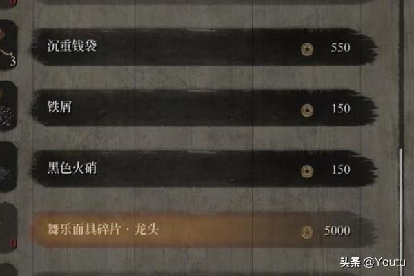 2、舞乐面具碎片龙头在苇名城地牢篝火边的商店购买5000文。