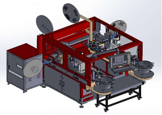 此设备可实现线材一端自动切线,激光打码,穿管热缩,剥皮,端子压着,穿胶壳,另一端激光打码,穿管热缩,剥皮,端子压着,穿胶壳等功能的全自动双端插胶壳机。